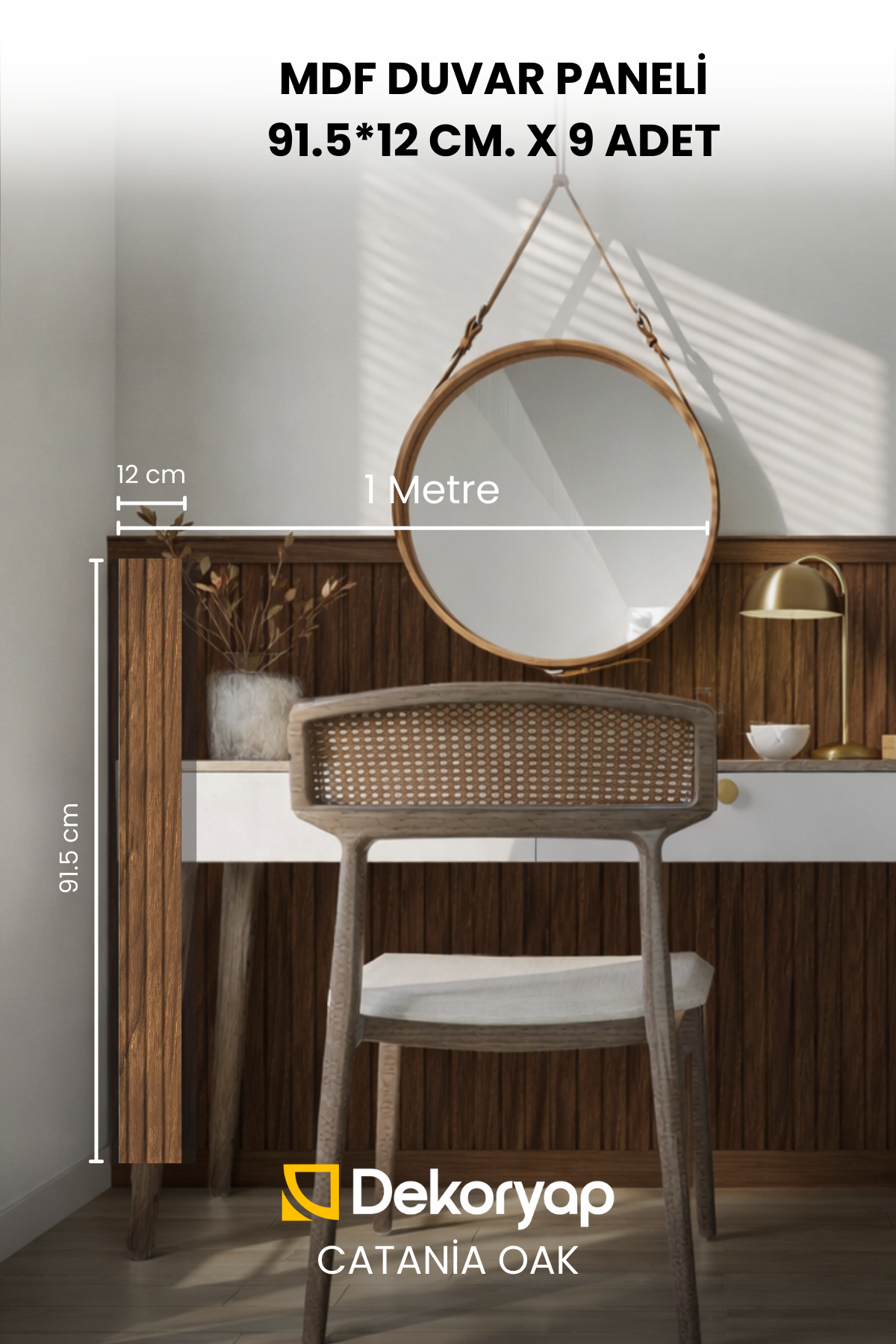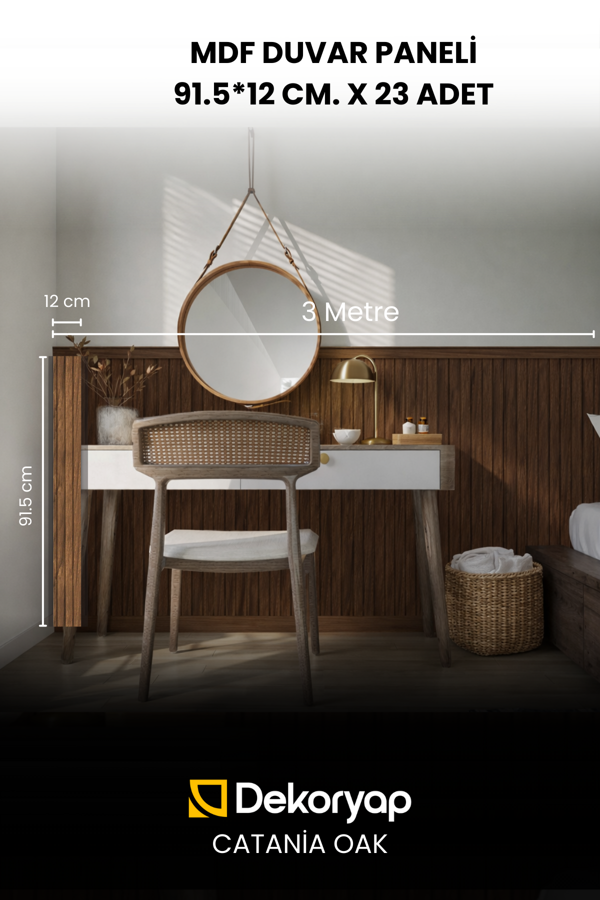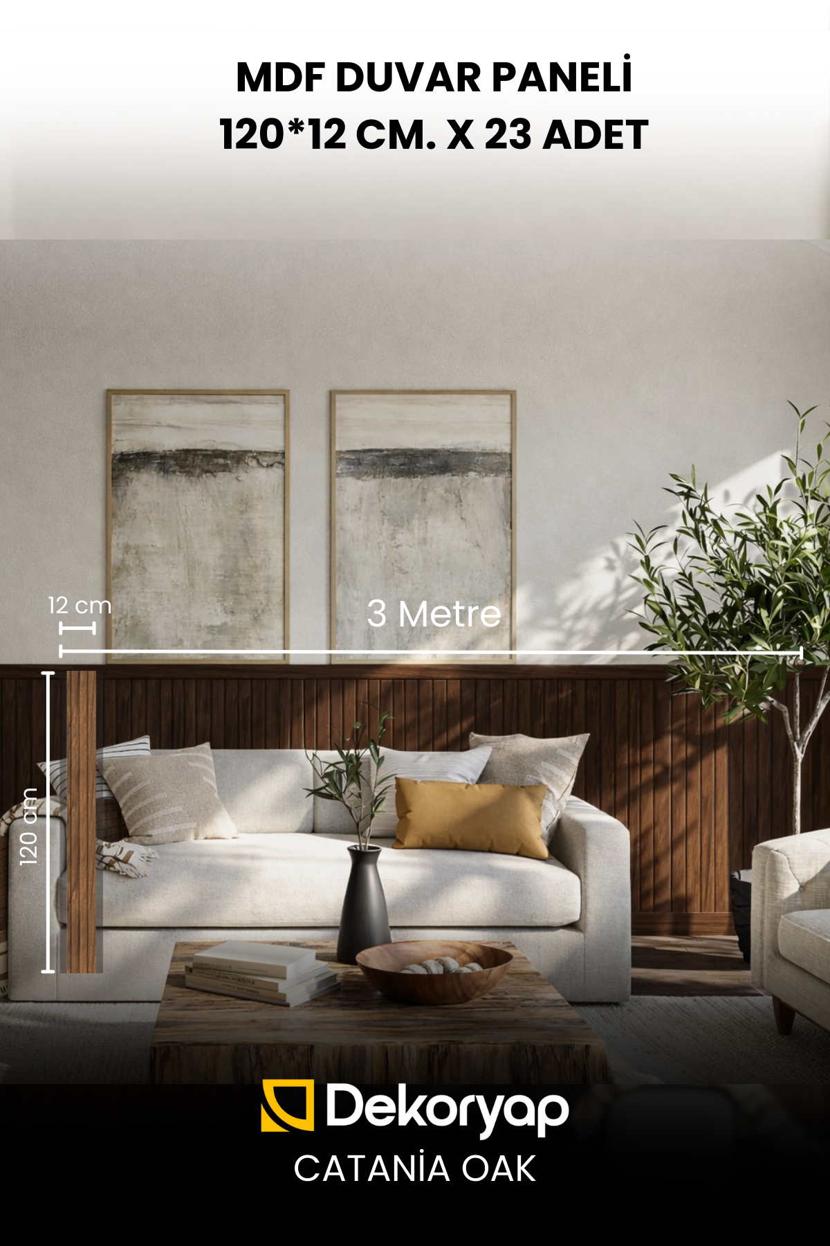 Dekoryap MDF Duvar Paneli Catania Oak, açık kahverengi ve doğal ahşap damarlarıyla iç mekânlara ferah, huzurlu ve şık bir atmosfer kazandırır. Ahşabın yumuşak dokusu ve yarı mat yüzeyi, ortama sıcaklık ve doğal bir zarafet katar.